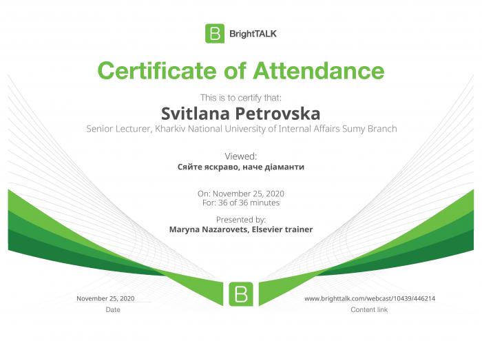 Старший викладач кафедри соціально-економічних дисциплін Сумської філії ХНУВС, кандидат економічних наук Світлана Петровська взяла участь у серії вебінарів «Читання – це навчання», «Сяйте яскраво, наче діаманти», «Не все те золото, що блищить», які були проведені офіційним тренером компанії Elsevier, головним бібліотекарем Наукової бібліотеки ім. М. Максимовича КНУ ім. Т. Шевченка Мариною Назаровець.