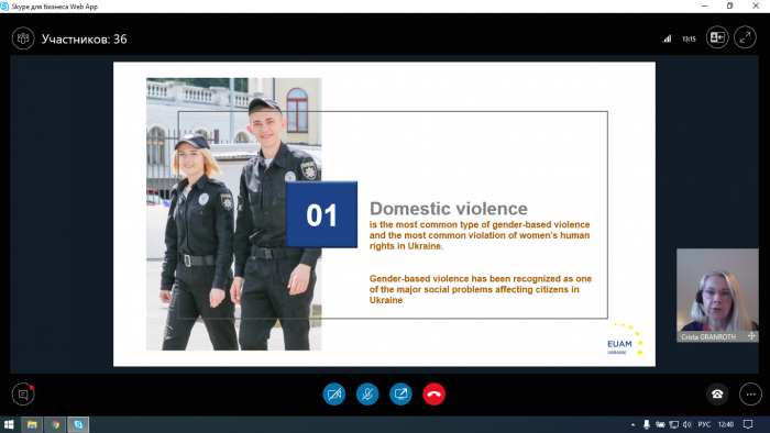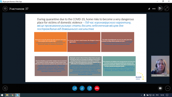 Під час заходу спікер розповіла про гендерне насильство та його ознаки, причини та види домашнього насильства, вплив пандемії COVID-19 на форми, тяжкість та збільшення кількості випадків домашнього насилля, зокрема в Україні та країнах ЄС.