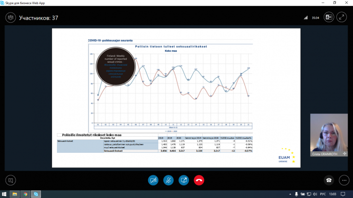 Присутнім була наведена статистика та короткий огляд скоєння насильницьких злочинів протягом 2019- 2020 років у Фінляндії та країнах ЄС. Під час вебінару розглянули також питання впливу пандемії COVID-19 на пошук, отримання допомоги жертвами домашнього насилля та шляхи вирішення даних проблем.