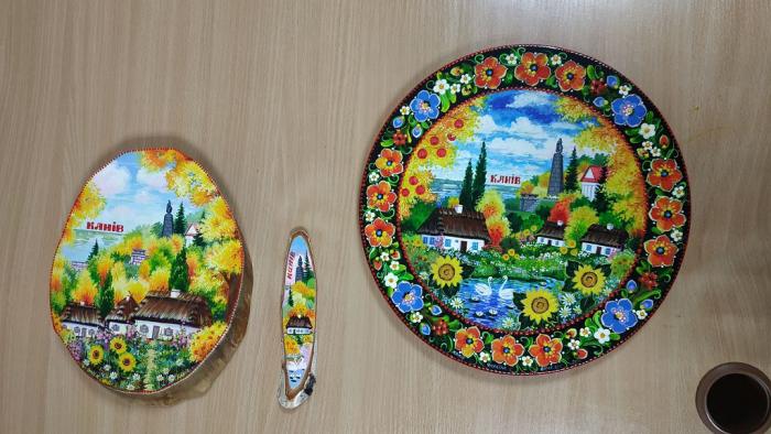 Яскраві декоративні тарілки, створені в традиціях петриківського розпису, презентувала зі своєї колекції мистецтвознавиця із Черкащини (м. Канів) Олеся Щербина.