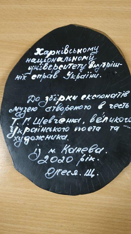 Попри карантин пошукова робота в Харківському національному університеті внутрішніх справ триває. І завдяки зусиллям ініціативної групи факультету № 2 у складі декана факультету №2 Костянтина Гарбузюка, заступника декана Сергія Гіренка, завідувача кафедри українознавства Ігоря Чорного та доценти кафедри українознавства Вікторії Перцевої Навчально-виставковий центр «Шевченко – душа українського народу» поповнився новими цікавими експонатами.