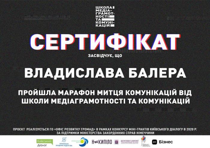 Курсантка 1 курсу факультету № 1 Харківського національного університету внутрішніх справ Владислава Балера, яка є членом Школи наукового лідерства факультету № 1, посіла 3 місце у Марафоні агентів змін Школи Медіаграмотності. Проєкт реалізувався ГО «Офіс розвитку громад» у межах конкурсу міні-грантів Київського діалогу в 2020 році за підтримки Міністерства закордонних справ Німеччини. Марафон тривав з 17 по 27 листопада. Головна мета заходу – навчити користувачів Інтернету перевіряти фейкову інформацію та ефективно захищати свої акаунти від впливу шахраїв. Протягом десяти днів Владислава виконувала різні завдання, пов'язані з медіаграмотністю: вчилася перевіряти кредитабельність медіаканалів, створювати двофакторні аутентифікації, знайомилася з персональними даними та їх обробкою, основами авторського права.