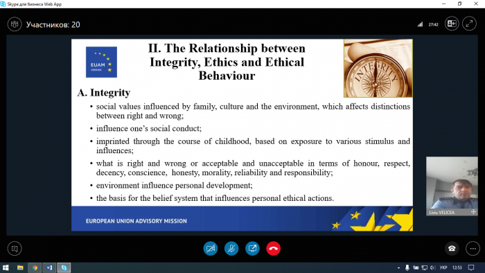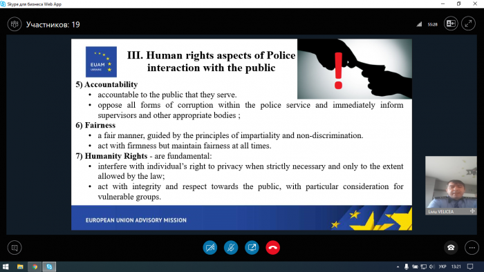 Основним спікером заходу виступив радник/тренер з питань взаємодії поліції з громадою від Регіонального представництва КМЄС у Харкові Лівіу Веліча (Румунія), який розповів про взаємозв'язок між етикою, доброчесністю та етичною поведінкою, про процес формування особистих систем цінностей, проаналізував результати міжнародного Індексу сприйняття корупції у 2019 році, а саме лідерів цього списку та країни, що опинилися у кінці списку, зокрема становище України у ньому, висвітлив правозахисні аспекти взаємодії поліції з громадськістю, а також поділився досвідом Румунії у вирішенні вищезазначених проблем.