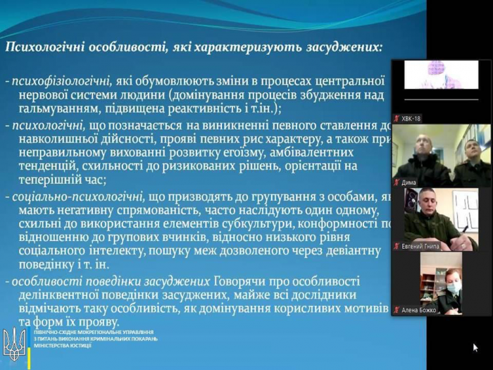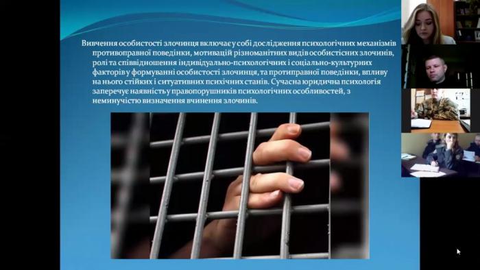 Відбулося онлайн-заняття за темами «Психологічні особливості ув’язнених та засуджених»; «Психологічний портрет ув’язнених та засуджених». Кафедра тісно співпрацює із соціально-психологічною службою ДКВС України та проводить такі наукові дослідження: психологічні особливості засуджених-рецидивістів корисливого та насильницького типів; заздрісність як чинник криміногенної поведінки особистості; соціально-психологічні характеристики злочинців-педофілів; емоційний інтелект та життєстійкість неповнолітніх засуджених.