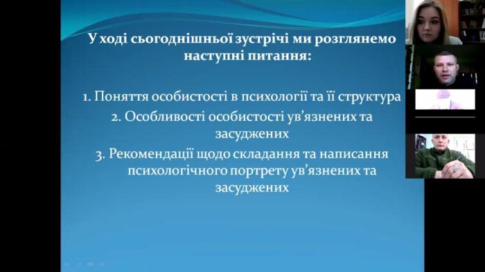Доцент кафедри соціології та психології, кандидат психологічних наук Володимир Філоненко ознайомив присутніх з найбільш узагальненими структурними компонентами портрету особистості засудженого/ув’язненого, серед яких соціально-демографічні, кримінально-правові та психолого-педагогічні характеристики. Роз’яснив важливість кожного з цих компонентів при складанні психологічного портрету засудженого чи ув’язненого та їх психологічної характеристики. Викладач кафедри соціології та психології Олена Мохорєва акцентувала увагу на теоретичному підході до вивчення поняття особистості у вітчизняній та зарубіжній психології, компонентах особистості та основних характеристиках особистості засудженого/ув’язненого. Також було розглянуто такі поняття, як темперамент, характер, акцентуації характеру, особливості емоційно-вольової та ціннісно-мотиваційної сфер.