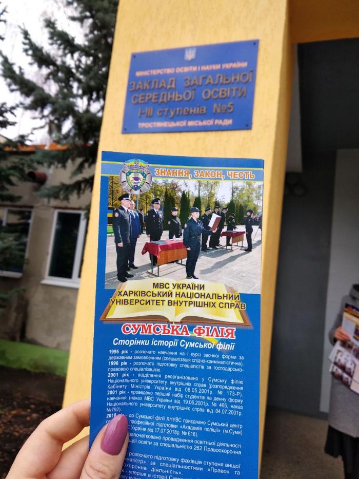 Студентки передали старшокласникам профорієнтаційні буклети, плакати та відеоролики про Сумську філію Харківського національного університету внутрішніх справ.