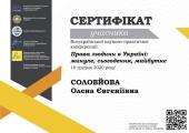 Доцент кафедри кримінального процесу, криміналістики та експертології факультету № 6 Харківського національного університету внутрішніх справ кандидат юридичних наук, доцент Олена Соловйова взяла участь у Всеукраїнській науково-практичній конференції «Права людини в Україні: минуле, сьогодення, майбутнє», що була організована Науково-дослідним інститутом публічної політики і соціальних наук, яка відбулася онлайн у м. Харків, та отримала сертифікат учасника конференції.