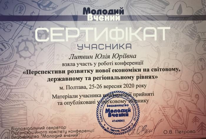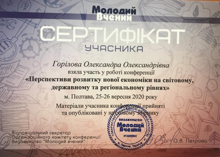 Студентки підготували тези за темою «Поняття «корпоративного конфлікту» як елементу економічної безпеки». За підсумками конференції було видано збірник матеріалів, який має всі необхідні атрибути: коди ISBN, УДК, ББК. Також відбулася розсилка обов’язкових примірників до Книжкової палати та основних наукових бібліотек України. Всі матеріали конференції розміщені за посиланням: URL: http://molodyvcheny.in.ua/files/conf/eko/44sept2020/30.pdf.