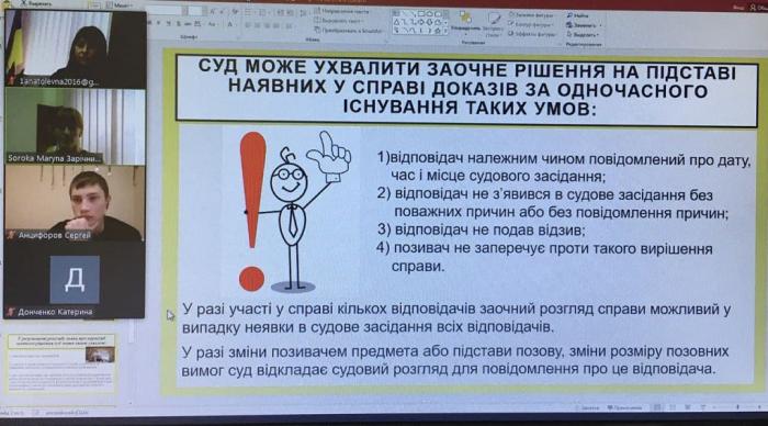 Професор кафедри юридичних дисциплін Сумської філії Харківського національного університету внутрішніх справ Наталія Горобець та доцент кафедри юридичних дисциплін Яна Садикова разом із суддею Зарічного районного суду м. Суми Альоною Севериновою провели бінарне заняття з дисципліни «Цивільний процес» для студентів 2–4 курсів. Тема зустрічі: «Заочний розгляд справи у цивільному процесі».