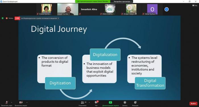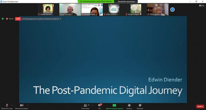 Упродовж вебінару було обговорено актуальні питання: цифрова трансформація в пост-пандемічний період (5G, хмарні обчислення, штучний інтелект) (Едвін Діндер); дискусія про цифрову трансформацію (Едвін Діндер та Надія Васильєва). Наприкінці заходу учасники отримали відповіді спікерів на запитання, які виникли впродовж вебінару.