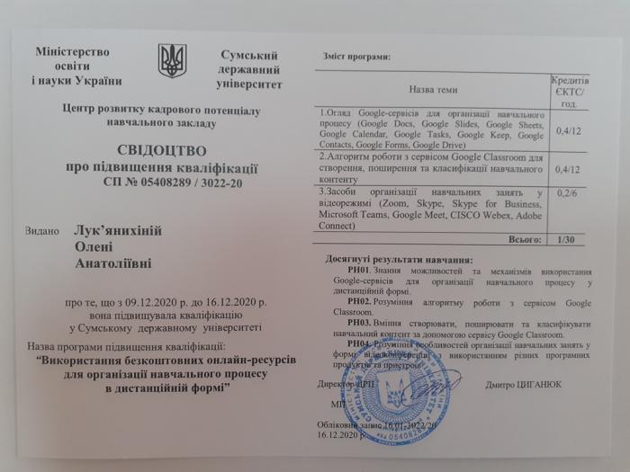 За результатами успішно завершеного навчання Олена Лук’янихіна отримала свідоцтво про підвищення кваліфікації встановленого зразка.