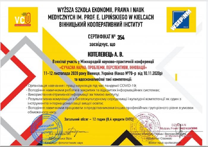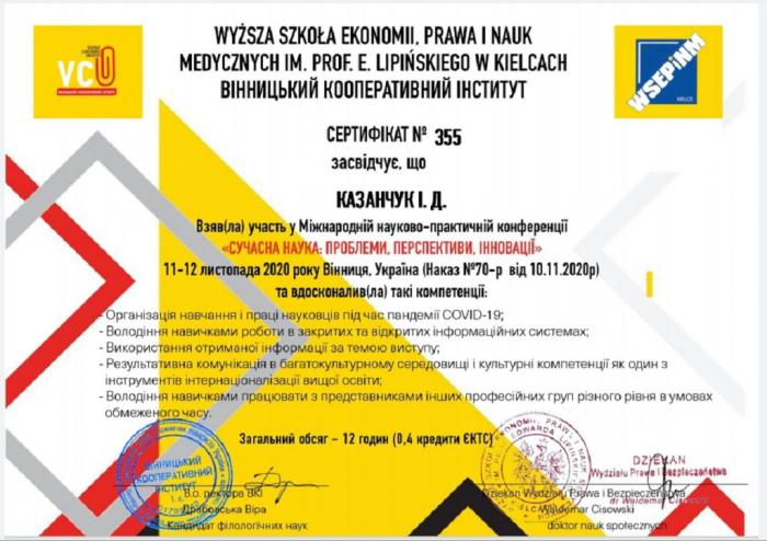 Активною є робота наукового гуртка кафедри адміністративного права та процесу факультету № 1. Член наукового гуртка курсантка факультету № 4 Аліна Котелевець разом зі своїм науковим керівником доценткою кафедри полковником поліції Іриною Казанчук взяла участь у роботі Міжнародної науково-практичної конференції «Сучасна наука: проблеми, перспективи, інновації». Конференція відбулася в онлайн-режимі з використанням платформи ZOOM на базі Вінницького кооперативного інституту за сприяння Міністерства освіти і науки України.