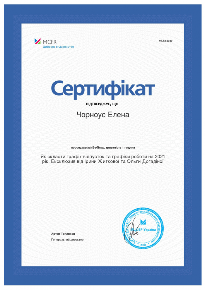 Доцентка кафедри правового забезпечення господарської діяльності факультету № 6 Харківського національного університету внутрішніх справ Олена Чорноус відвідала вебінари за темами «Локдаун: початок. Що робити кадровику» та «Як скласти графік відпусток та графіки роботи на 2021 рік». Отримані знання сприятимуть підвищенню професійного рівня та будуть застосовані у практичній та науковій діяльності. За результатами участі у вебінарах Олена Чорноус отримала відповідні сертифікати.