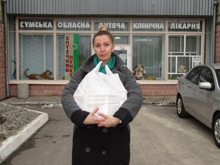 Як з’ясувалося, малечу доправили до обласної дитячої лікарні з діагнозом «гостра гіпотермія» і наразі дівчинка знаходиться у реанімаційному відділенні. Зателефонувавши лікарям, з’ясували про потребу у засобах догляду за новонародженими: підгузки, вологі серветки та дитяча присипка. І вже наступного дня волонтери Сумської філії передали всі необхідні речі до реанімаційного відділення.