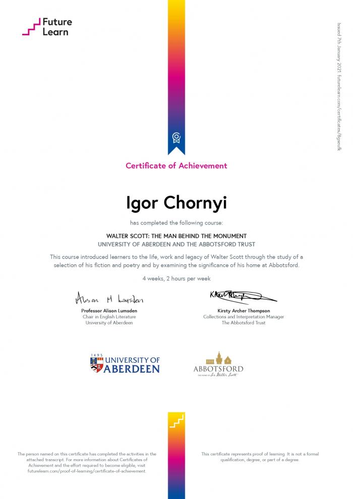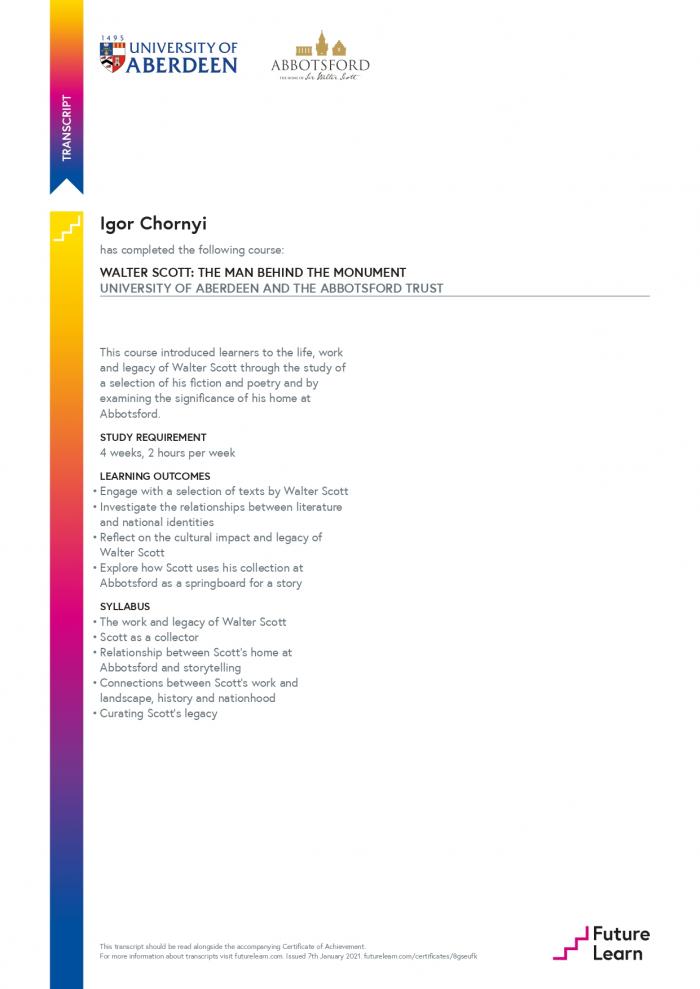 Попри карантин та локдаун науково-педагогічний склад університету бере участь у різних програмах дистанційної самоосвіти. Викладачі вдосконалюють педагогічну майстерність, поглиблюють знання в царині своїх наукових інтересів. Так завідувач кафедри українознавства факультету № 2 доктор філологічних наук, професор Ігор Чорний, який вже багато років плідно займається дослідженням історичних жанрів у літературі, пройшов у Абердинському університеті (Велика Британія) чотиритижневий дистанційний курс, присвячений життю та творчості фундатора жанру історичного роману Вальтера Скотта, якого сучасники називали «шотландським чародієм».
