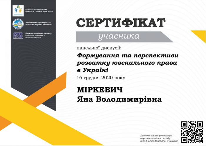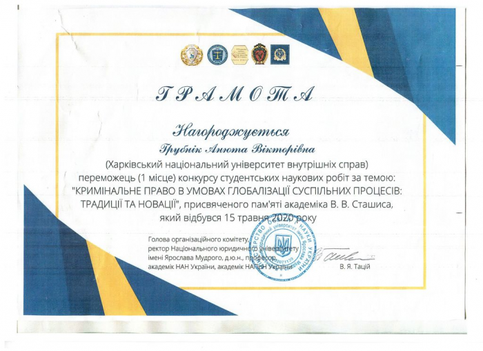 - Курсантка 4 курсу факультету № 1 Анюта Грубнік взяла участь у Конкурсі студентських наукових робіт, присвяченому пам’яті академіка В.В. Сташиса «Кримінальне право в умовах глобалізації суспільних процесів: традиції та новації», який відбувся у Науково-дослідному інституті вивчення проблем злочинності імені академіка В.В. Сташиса. Її наукова робота на тему «Кримінальне законодавство України на сторожі запобігання виникненню і поширенню на території України гострої респіраторної хвороби COVID-19, спричиненої коронавірусом SARS-COV-2» була визнана кращою в категорії «Студенти». Анюта Грубнік була нагороджена дипломом 1 ступеня.