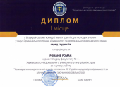 - Курсант 3 курсу факультету № 4 Роман Романів взяв участь у Всеукраїнському конкурсі малих грантів для молодих вчених в галузі кримінального права, кримінології та кримінально-виконавчого права, який був ініційований громадською організацією «Всеукраїнська асоціація кримінального права». Наукова робота курсанта на тему «Компаративно-критичний аналіз положень КК України щодо відповідальності за злочини, вчинені злочинною спільнотою» була визнана кращою в категорії «Студенти», а її автора нагороджено дипломом 1 ступеня та грошовим призом.