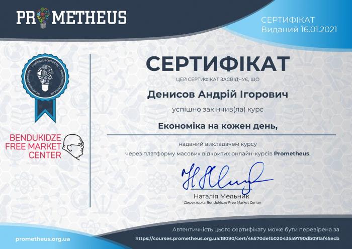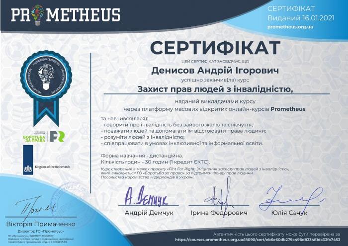 Доцент кафедри правового забезпечення господарської діяльності факультету № 6 ХНУВС Андрій Денисов успішно закінчив дистанційні курси «Економіка на кожен день», «Дистанційна робота для публічних службовців», «Захист прав людей з інвалідністю» (створений у межах проєкту «Fiht For Right: Зміцнення захисту прав людей з інвалідністю», який виконується ГО «Боротьба за права» за підтримки Фонду прав людини Посольства Королівства Нідерландів в Україні) та «Зміцнення викладання та організаційного управління в університетах». Курси були надані через платформу масових відкритих онлайн-курсів Prometheus.