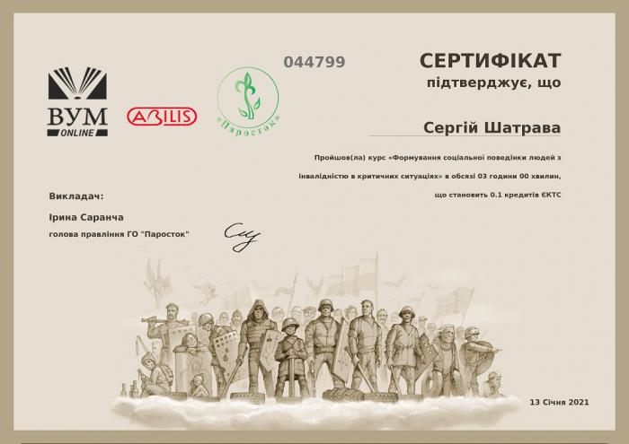 Метою курсу «Формування соціальної поведінки людей з інвалідністю в критичних ситуаціях» є покращення якості життя осіб з інвалідністю, які проживають в Україні, шляхом створення можливості інклюзивної онлайн-освіти із сурдоперекладом і соціально-психологічною підтримкою, а також отримання людьми з інвалідністю необхідних знань та умінь для забезпечення своїх базових прав і потреб в умовах пандемії Covid-19 та інших критичних ситуаціях. Викладачами курсу були розглянуті такі теми: «Кризи – виклики для кожного», «Що таке COVID-19. Як вести себе під час пандемії», «Планування життя під час кризової ситуації та виходу з неї».