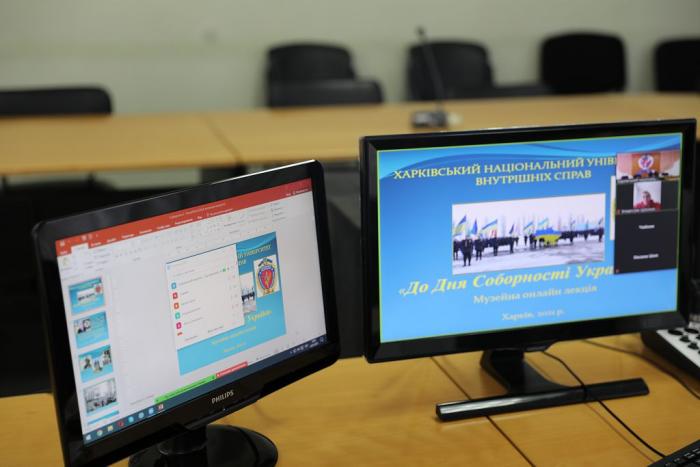 З нагоди Дня Соборності України для курсантів першого курсу факультетів № 1-4 Харківського національного університету внутрішніх справ було проведено музейну онлайн-лекцію. До заходу також долучились згідно з карантинними нормами слухачі інституту післядипломної освіти ХНУВС.