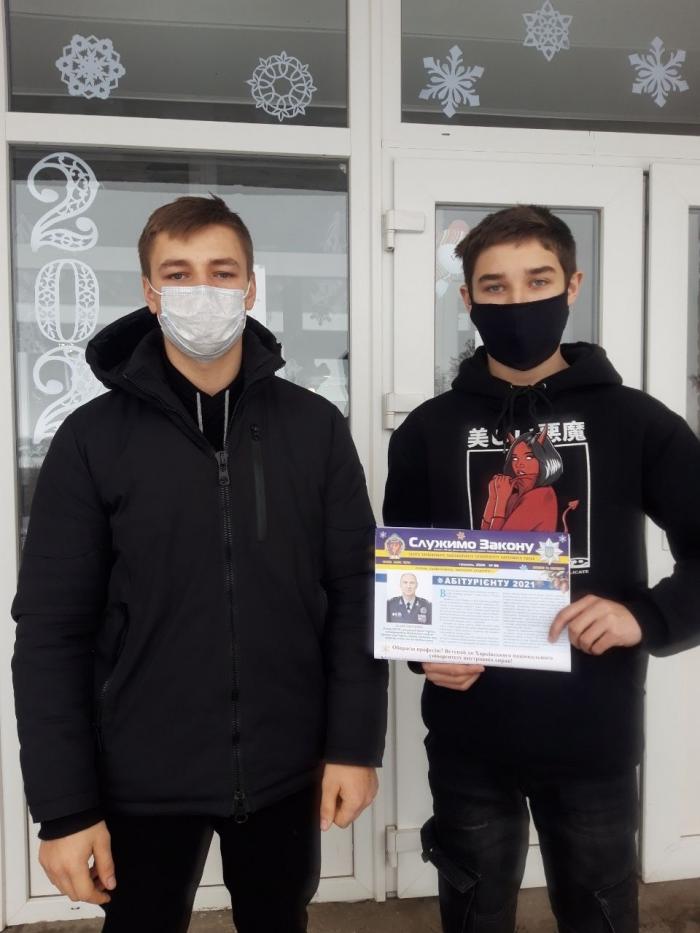 Студенти 3 курсу факультету № 6 Харківського національного університету внутрішніх справ Олександр Киргиз та Андрій Решетніков провели профорієнтаційну роботу у навчальних закладах м. Новомиргород Кіровоградської області. Студенти відвідали Новомиргородські ЗОШ № 1, 2, 3, Златопільську гімназію та передали керівництву навчальних закладів інформаційну продукцію про університет. Керівництво шкіл запросило представників факультету поспілкуватися безпосередньо з учнями після послаблення карантинних заходів. Студентів підготували завідувач кафедри цивільного права та процесу Юрій Жорнокуй та доцентка кафедри Тетяаи Кириченко
