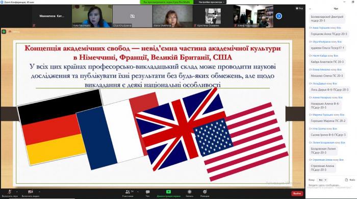 На кафедрі соціології та психології факультету № 6 відбувся «круглий стіл» на тему «Академічна свобода як принцип розвитку вищої освіти за сучасних соціальних умов». Основним доповідачем стала Ірина Нечітайло – професорка кафедри соціології та психології, експертка з акредитації освітніх програм НАЗЯВО, сертифікована тренерка експертів з акредитації. На «круглому столі» були присутні як викладачі кафедри соціології та психології, так і здобувачі вищої освіти, що навчаються психології за освітніми програмами першого, другого і третього рівнів вищої освіти. Упродовж зустрічі обговорювалися принципи академічної свободи, розглядалися особливості їх реалізації в Україні та за кордоном (у Німеччині, Франції, Сполучених Штатах Америки та ін.), обговорювалися питання меж академічної свободи, які обов’язково мають бути, висвітлювалися особливості реалізації академічної свободи на загальносистемному, організаційному та індивідуальному рівнях.