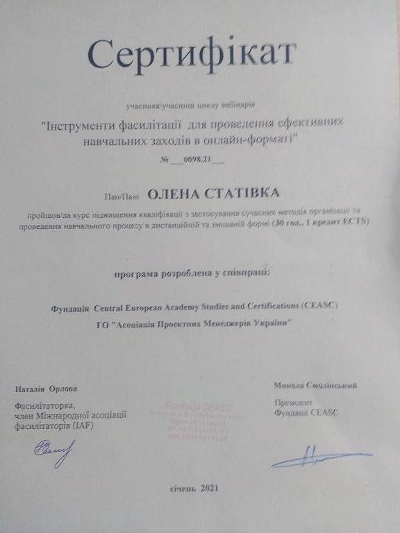 У межах підвищення кваліфікації із застосування сучасних методів організації та проведення навчального процесу в дистанційній та змішаній формі завідувачка кафедри іноземних мов факультету № 1 кандидат педагогічних наук Олена Статівка пройшла цикл вебінарів «Інструменти фасилітації для проведення ефективних навчальних заходів в онлайн-форматі» від Фундації Central European Academy of Studies and Certification (CEASC) у співпраці з ГО «Асоціація Проєктних Менеджерів України».