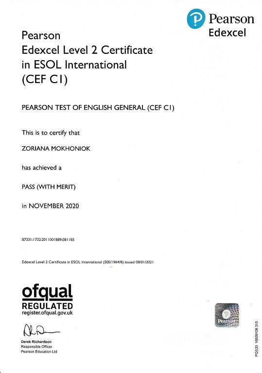 Старший викладач кафедри гуманітарних дисциплін Сумської філії ХНУВС Зоряна Мохоньок склала мовний тест Pearson Test of English General (CEF C1). Pearson Tests of English – лінійка міжнародних екзаменів, орієнтованих на кандидатів, які не є носіями англійської мови. Тест оцінює наскільки добре аплікант розуміє носіїв мови і грамотно висловлює свої думки в усній і письмовій формі.