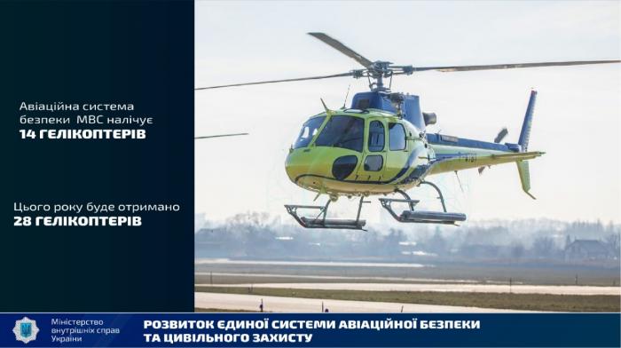 «Нацполіція отримала перші 2 сучасні гелікоптери Н-145, 2 гелікоптери Н-125 отримала Держприкордонслужба, 10 – ДСНС та НГУ Наразі триває підготовка пілотів та техніків. У планах на цей рік – отримання ще 28 гелікоптерів для потреб усіх служб системи МВС», - сказав Арсен Аваков.