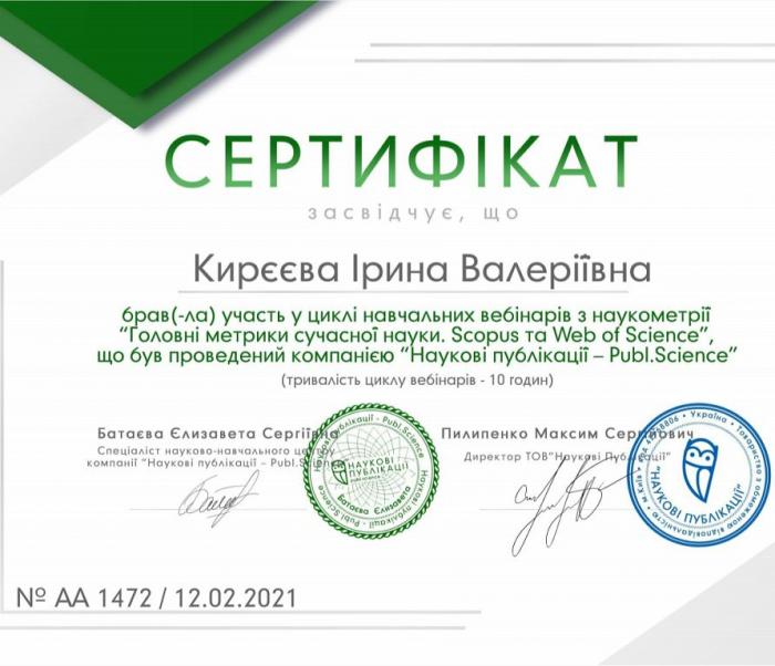 Доцентки кафедри правового забезпечення господарської діяльності факультету № 6 Харківського національного університету внутрішніх справ Ірина Кирєєва, Дар’я Коробцова та Ірина Василько взяли участь у циклі навчальних вебінарів із наукометрії «Головні метрики сучасної науки. Scopus та Web of Science», що був проведений компанією «Наукові публікації – Publ.Science».