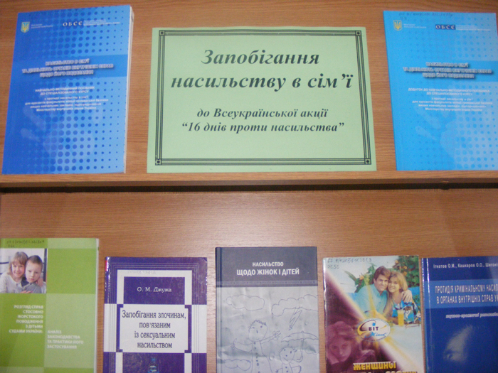 У бібліотеці Харківського національного університету внутрішніх справ проведено інформаційно-просвітницькі заходи «Світ без насильства». Вони проходили у рамках Всеукраїнської акції «16 днів без насильства», ініційованої у 1991 році Інститутом Жіночого Глобального Лідерства і підтриманою владою та громадськими організаціями більш ніж у 130 країнах світу. Акція проводиться з метою підвищення обізнаності курсантів студентів та усіх небайдужих людей щодо нетерпимого ставлення до насильства.
