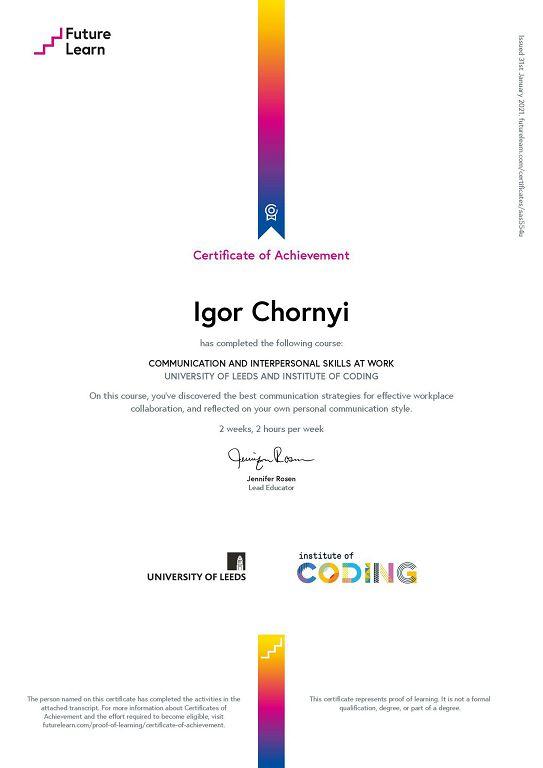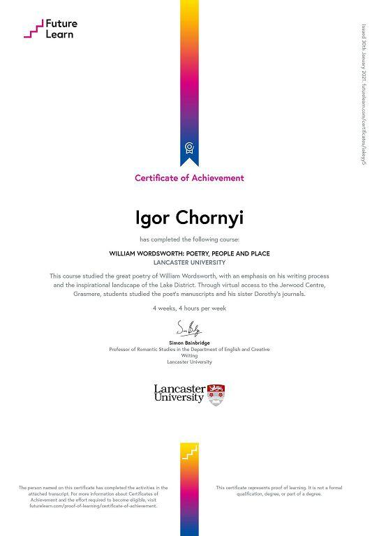 Складна і досить жорстка ситуація, в якій опинилися викладачі і науковці в умовах карантину, не позбавляє необхідності продовжувати процес самоосвіти, самовдосконалення, адже той, хто вчить, і сам повинен постійно вчитись, щоб підвищувати свою педагогічну майстерність, знати про те, які процеси відбуваються у науковій сфері. Завідувач кафедри українознавства факультету № 2 доктор філологічних наук, професор Ігор Чорний пройшов два англомовних дистанційних курси на британській платформі FutureLearn. Один із них, «Комунікативні та міжособистісні навички на роботі», присвячений сучасним теоріям комунікації, спілкуванню з керівництвом та підлеглими, є дуже корисним для розуміння західноєвропейських теорій комунікації. Інший, «Вільям Вордсворт: поезія, люди та місце», пропонує поглибити свої знання щодо історії англійської літератури, зокрема, творчості поета-романтика ХІХ ст. В. Вордсворта.