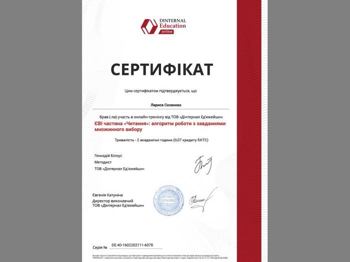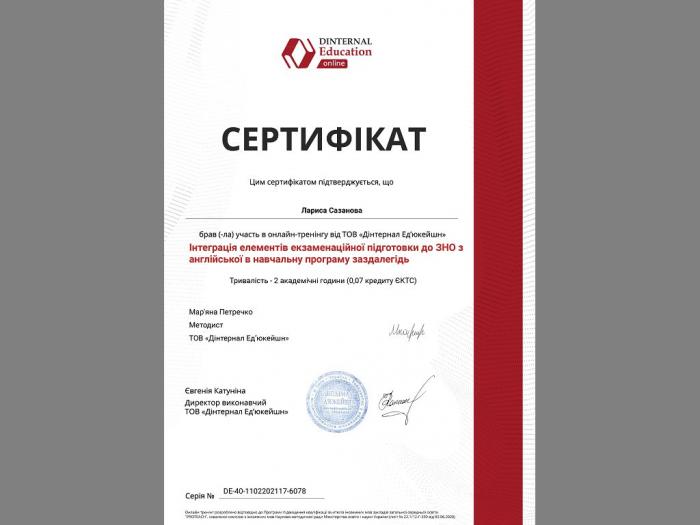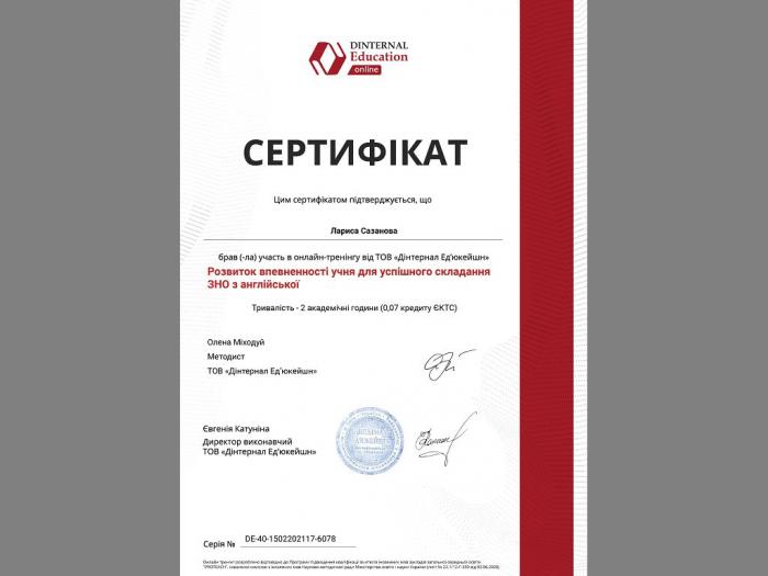 Старша викладачка кафедри іноземних мов факультету № 1 Лариса Сазанова взяла участь у серії дистанційних тренінгів та вебінарів Міжнародного освітньо-методичного центру Дінтернал Ед’юкейшн з підготовки абітурієнтів до складання ЄВІ.