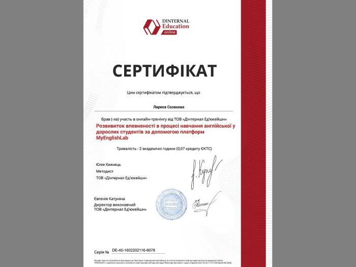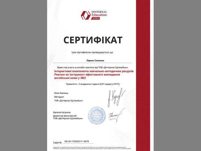 Лариса Сазанова отримала сертифікати за результатами участі у тренінгах та вебінарах з підтвердженням підвищення кваліфікації (12 академічних годин – 0,42 кредита ECTS). Набутий буде використовуватися у практичних заняттях з іноземної мови професійного спрямування.