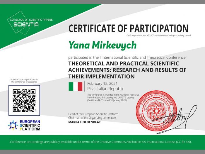 Викладач кафедри кримінального права і кримінології факультету № 1 Тетяна Шевчук разом із курсантом 4 курсу цього ж факультету Яною Міркевич взяли участь у роботі Міжнародної науково-теоретичної конференції «Тheoretical and practical scientific achievements: research and results of their implementation», яка відбулася дистанційно у м. Піза, Iталія.