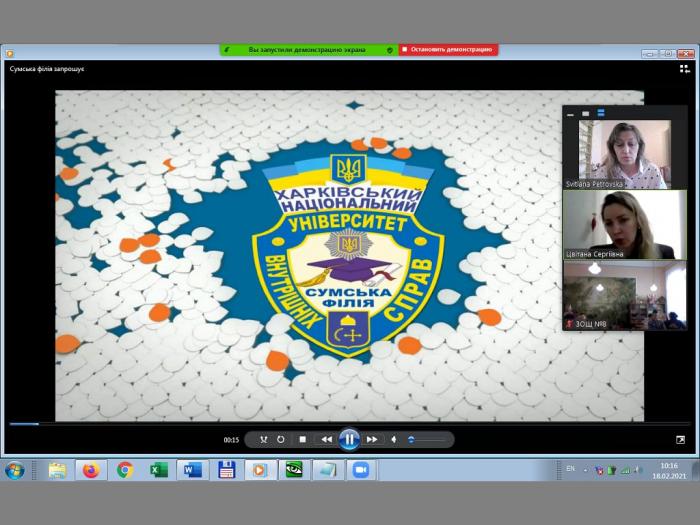 У рамках профорієнтаційної роботи Сумської філії Харківського національного університету внутрішніх справ старший викладач кафедри соціально-економічних дисциплін Світлана Петровська та провідний фахівець Цвітана Баранова провели онлайн-зустріч за допомогою платформи Zoom з учнями 11 класу Сумської загальноосвітньої школи І-ІІІ ступенів № 8.