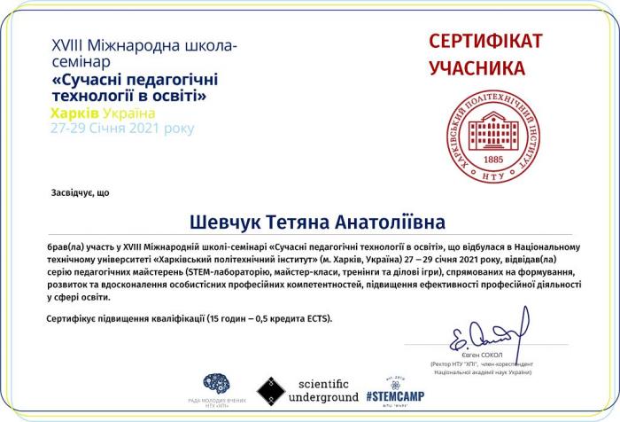 Отримані знання будуть застосовані у рамках навчальних дисциплін, що викладаються на кафедрі. Після проходження програми Міжнародної методичної школи-семінару «Сучасні педагогічні технології в освіті» викладачі кафедри отримали відповідні сертифікати про підвищення рівня професійної кваліфікації.