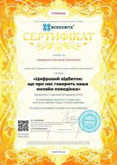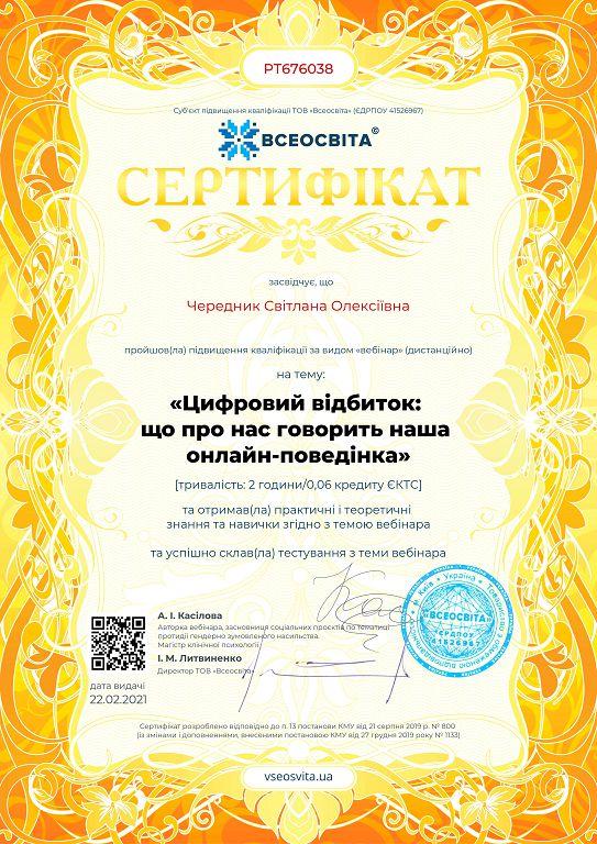 Викладачка циклової комісії філологічних дисциплін Кременчуцького льотного коледжу Харківського національного університету внутрішніх справ Світлана Чередник взяла участь у вебінарі «Цифровий відбиток: що про нас говорить наша онлайн-поведінка» проєкту «Всеосвіта».