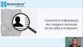 Спікерка надала актуальну інформацію щодо явища цифрового відбитка. Вона пояснила, як розвинути первинні навички критичного мислення в онлайн-просторі та онлайн-поведінці, у тому числі захисті персональних даних. Цифровий відбиток – це кожна наша дія в Інтернеті: обрання сайтів, покупка товарів, перегляд фільмів, користування програмами. Завдяки цьому онлайн-алгоритми знають про користувачів абсолютно все – починаючи від вподобань і завершуючи персональними даними, які зловмисники використовують для досягнення власних цілей: різних афер, грошових махінацій та ін.