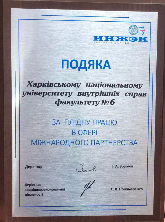 Харківський національний університет внутрішніх справ отримав Подяку від бізнес-центру Харківського національного економічного університету ім. Семена Кузнеця за плідну співпрацю у сфері міжнародного партнерства щодо залучення на навчання та підготовку іноземних громадян.