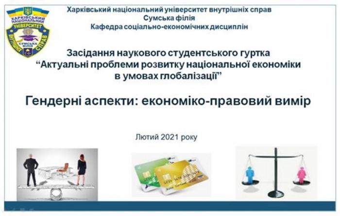 Дослідження економічних і правових аспектів виникнення, поширення гендерної нерівності, пошуку шляхів зменшення дискримінаційних процесів і явищ у різних сферах суспільних відносин є актуальною тематикою сьогодення. Планове засідання наукового гурта кафедри соціально-економічних дисциплін Сумської філії Харківського національного університету внутрішніх справ «Актуальні проблеми розвитку національної економіки в умовах глобалізації» теж було присвячене одному з аспектів цього явища. Зі вступним словом до присутніх звернулася кандидат економічних наук доцент Олена Лук’янихіна.
