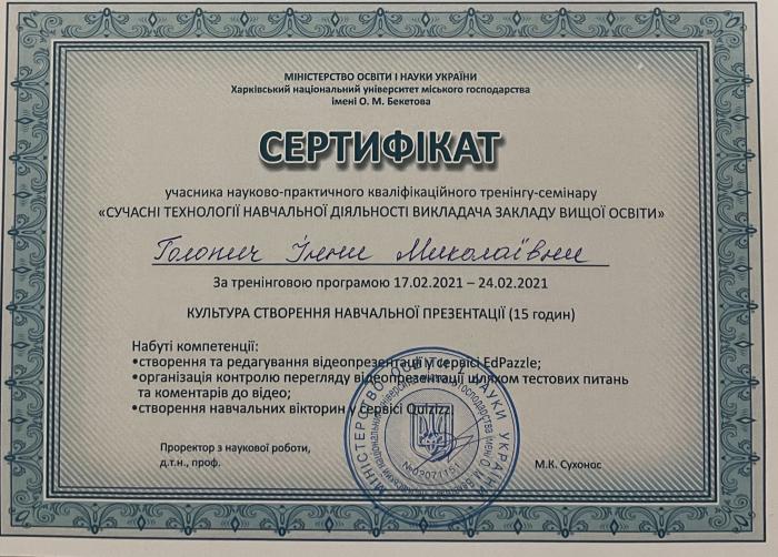 Під час опанування двох тренінгових програм «Культура створення навчальної презентації» та «Риторичні прийоми ефективної діяльності викладача ЗВО» було набуто такі компетентності: створення та редагування відеопрезентації у сервісі EdPazzle; рганізація контролю перегляду відеопрезентації шляхом тестових питань та коментарів до відео; створення навчальних вікторин у сервісі Quizizz; володіння технологією підготовки публічного виступу; здатність організовувати ефективну комунікацію з різними аудиторіями; володіння техніками комунікативних маніпулювань та техніками протистоянь маніпулюванням.