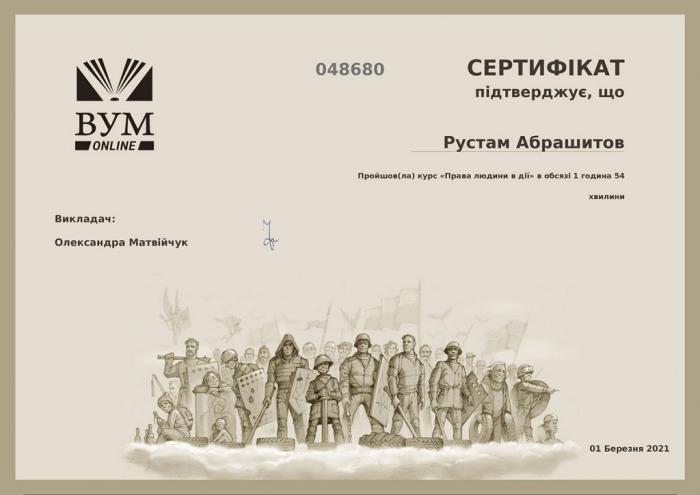 Начальник відділу міжнародних зв'язків та міжвузівської роботи Кременчуцького льотного коледжу Харківського національного університету внутрішніх справ Рустам Абрашитов пройшов онлайн-курс підвищення кваліфікації «Права людини в дії».