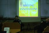 Старший викладач кафедри Сазанова Л. С. ознайомила присутніх із рекомендаціями зі складання анотації. Під час жвавої дискусії курсанти та гості обмінювалися інформацією щодо правильного оформлення анотації до статті. Майбутні науковці розглянули приклади написання анотації англійською мовою, визначили шляхи пошуку потрібної інформації в бібліотечних та автоматизованих системах, оцінили необхідність практичного використання першоджерел.