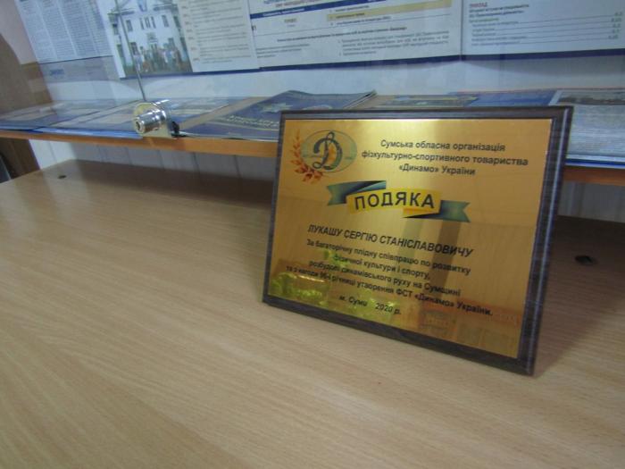 За багаторічну плідну співпрацю по розвитку фізичної культури і спорту, розбудові динамівського руху на Сумщині та з нагоди 96-ї річниці утворення ФСТ «Динамо» директор Сумської філії ХНУВС Сергій Лукаш отримав Подяку.