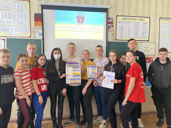 Під час зустрічі зі старшокласниками представниця університету розповіла про факультети та спеціальності, за якими здійснюється підготовка фахівців, про переваги навчання у ХНУВС, роз’яснила правила вступу до університету, ознайомила з його структурою, надала рекламно-агітаційні матеріали та ін.