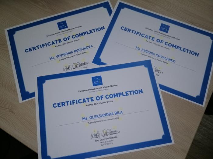 Студентки 2 курсу Сумської філії Харківського національного університету внутрішніх справ Євгенія Будюкова, Олександра Біла та Євгенія Коваленко прослухали триденний вебінар щодо захисту основних прав та свобод людини. Він був організований дорадчою місією Європейського Союзу в Україні з питань реформування цивільного сектору безпеки. Спікером заходу виступив керівник місії EUAM – Анті Джухані Хартікайнен. За результатами участі у вебінарі студентки отримали сертифікати про успішне закінчення курсу.