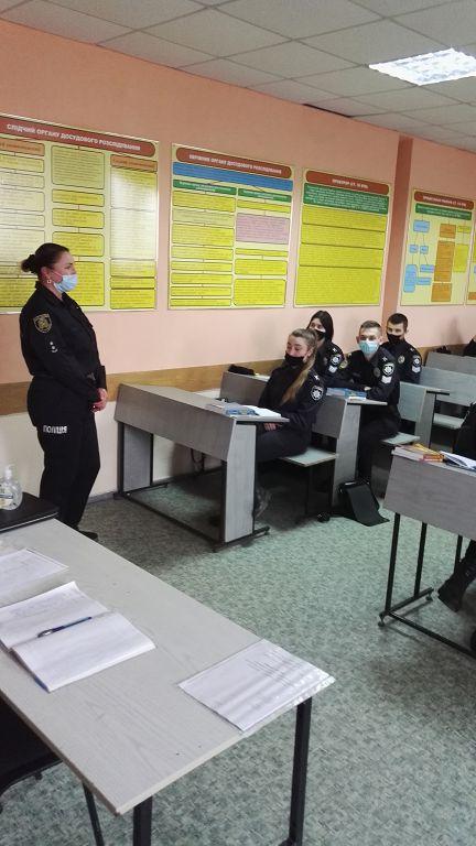 Під час заняття представниця практичного підрозділу поліції розповіла курсантам про свій досвід роботи в органах слідства, про справи, які були пов’язані з охороною довкілля та використанням природних ресурсів. Також йшлося про зловживання в сфері використання земель.