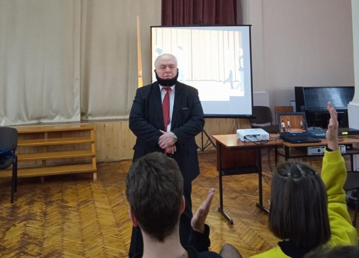 Доцент кафедри соціології та психології факультету № 6 ХНУВС Юрій Александров, методист факультету № 6 Олександр Шульгін, інспектор факультету № 3 Дар’я Балаш і студентка четвертого курсу факультету № 6 Тетяна Хворост провели профорієнтаційну зустріч з учнями 9-11 класів ЗОШ № 18 м. Харкова.