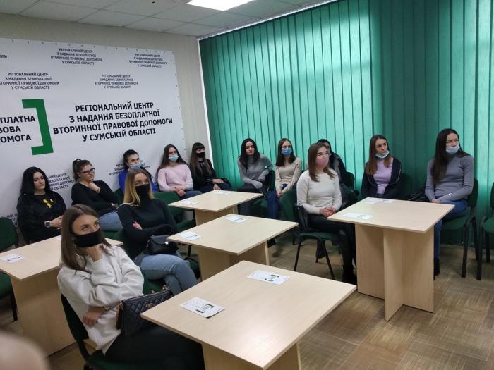 Студенти-консультанти юридичної клініки «Правова допомога» Сумської філії Харківського національного університету внутрішніх справ разом із керівником юридичної клініки Мариною Василенко відвідали Регіональний центр з надання безоплатної вторинної правової допомоги у Сумській області.